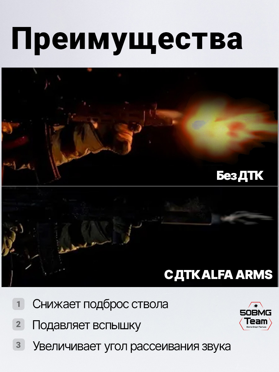 Газоразгруженный дульный тормоз-компенсатор (ДТК) Alfa Arms был разработан с учетом потребностей армейских и полицейских спецподразделений. Его уникальная конструкция значительно снижает обратный заброс, что улучшает точность стрельбы и уменьшает вероятность попадания пороховых газов в органы зрения и дыхания стрелка. Кроме того, применение такого ДТК снижает нагрузку на механизмы оружия, что способствует его долговечности. ДТК Alfa Arms обладает высоким ресурсом, меньше подвержен перегреву и эффективно гасит отдачу.