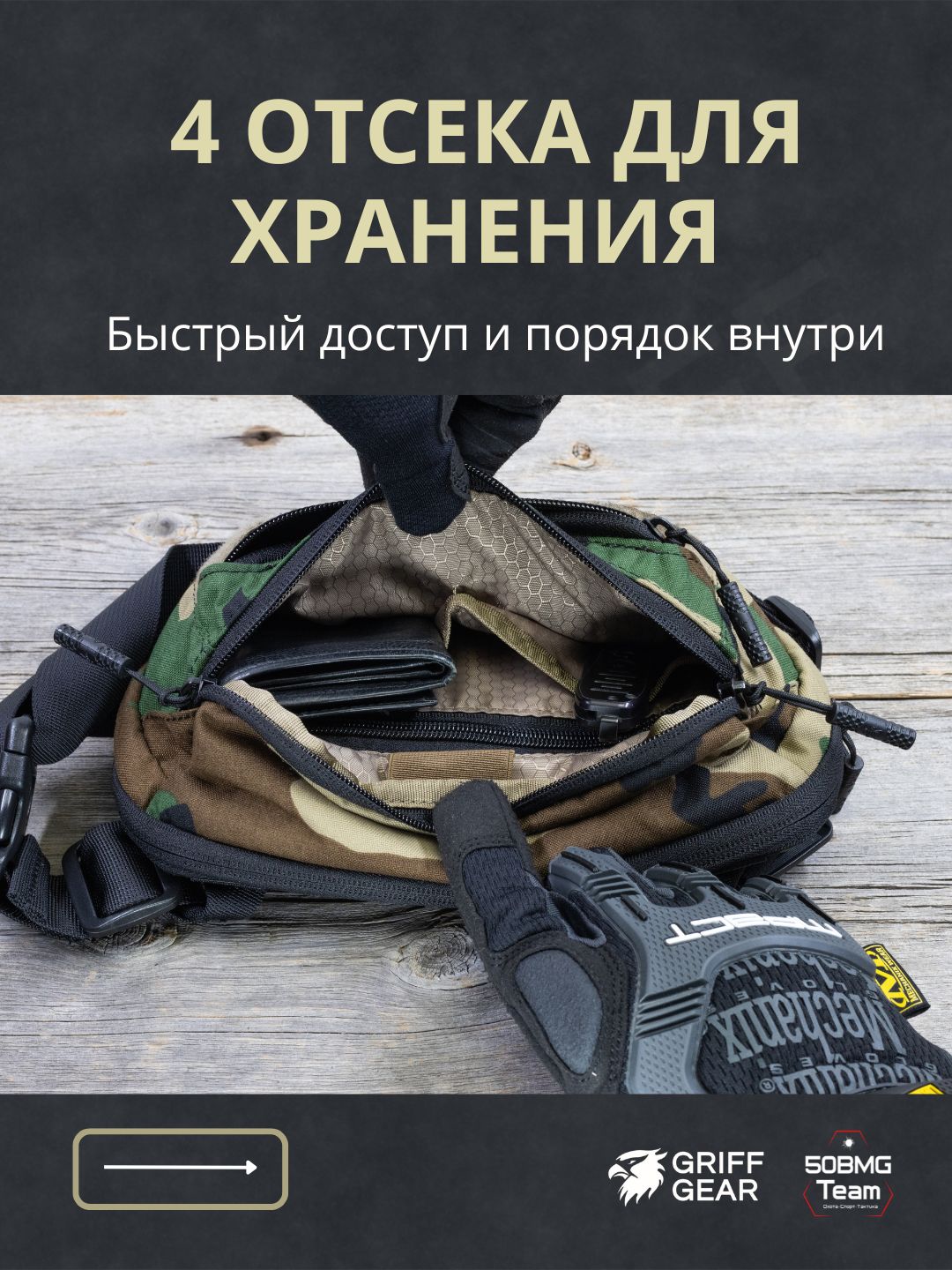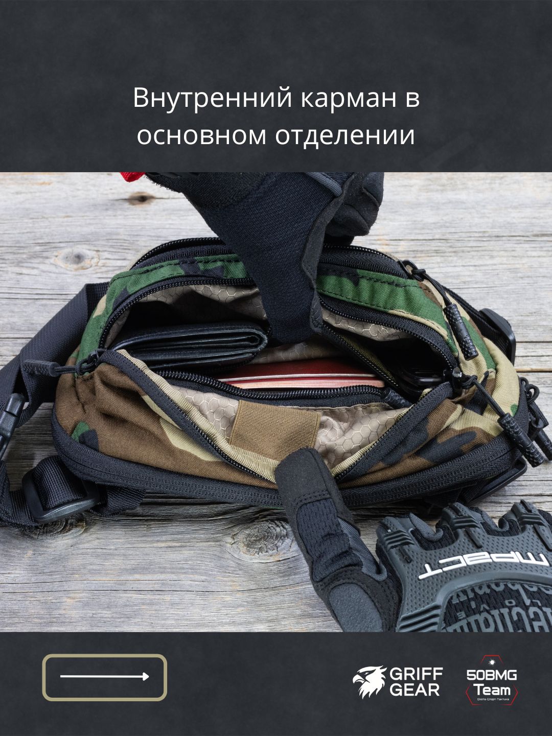 Внутри предусмотрены 4 отсека для удобной организации снаряжения: фронтальный, основное отделение, отделение для оружия, тыльный карман.
