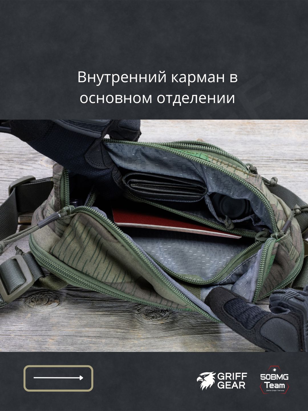 Внутри предусмотрены 4 отсека для удобной организации снаряжения: фронтальный, основное отделение, отделение для оружия, тыльный карман.