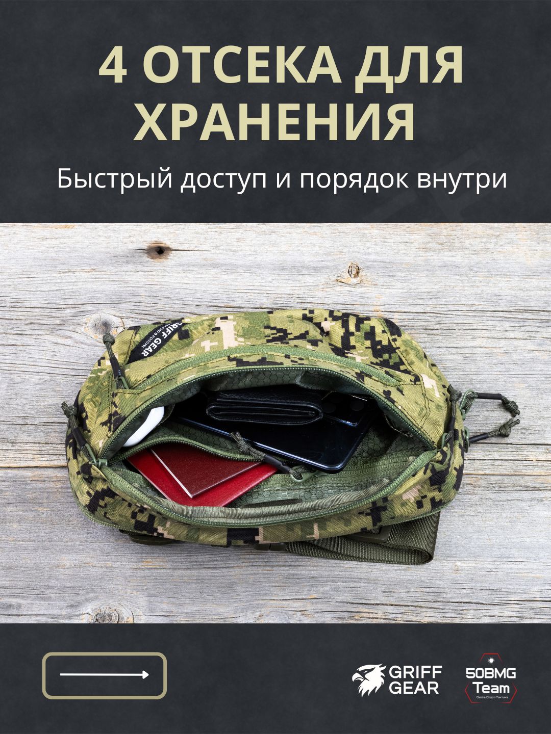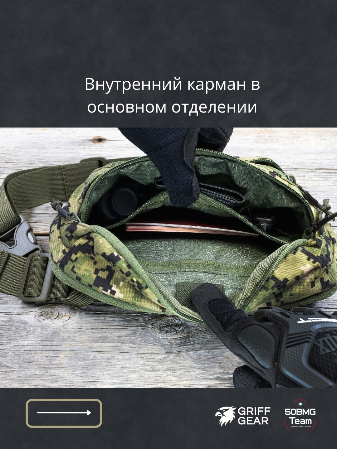 Внутри предусмотрены 4 отсека для удобной организации снаряжения: фронтальный, основное отделение, отделение для оружия, тыльный карман.