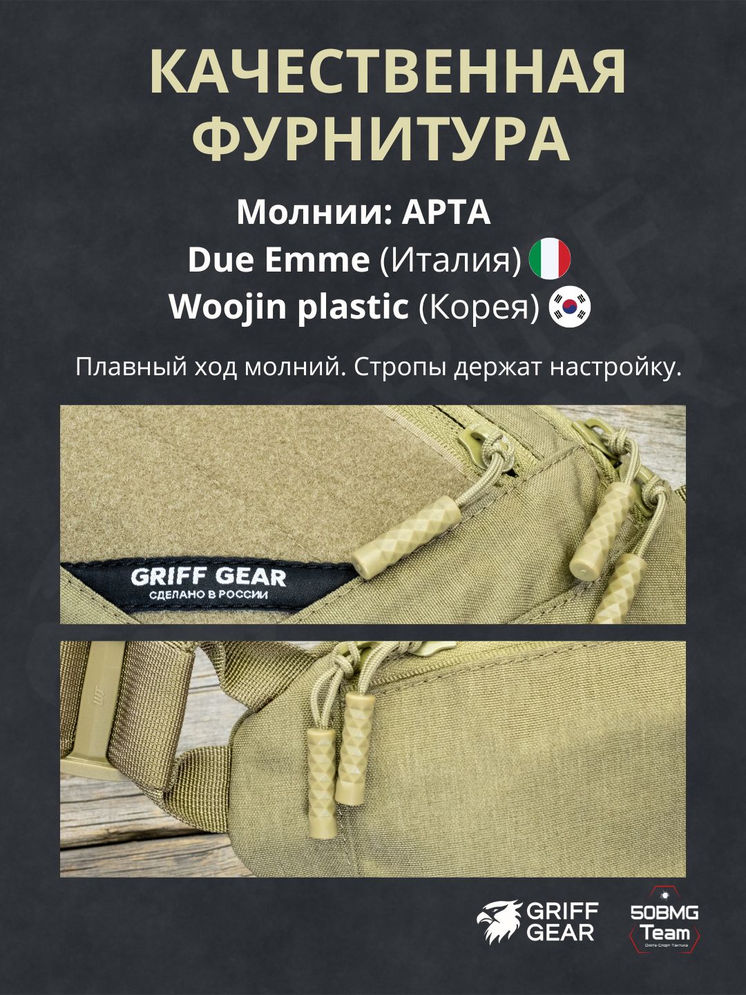 Внутри расположена панель с липучкой для крепления органайзеров, а на лицевой стороне — липучка под патчи и светоотражающие элементы.