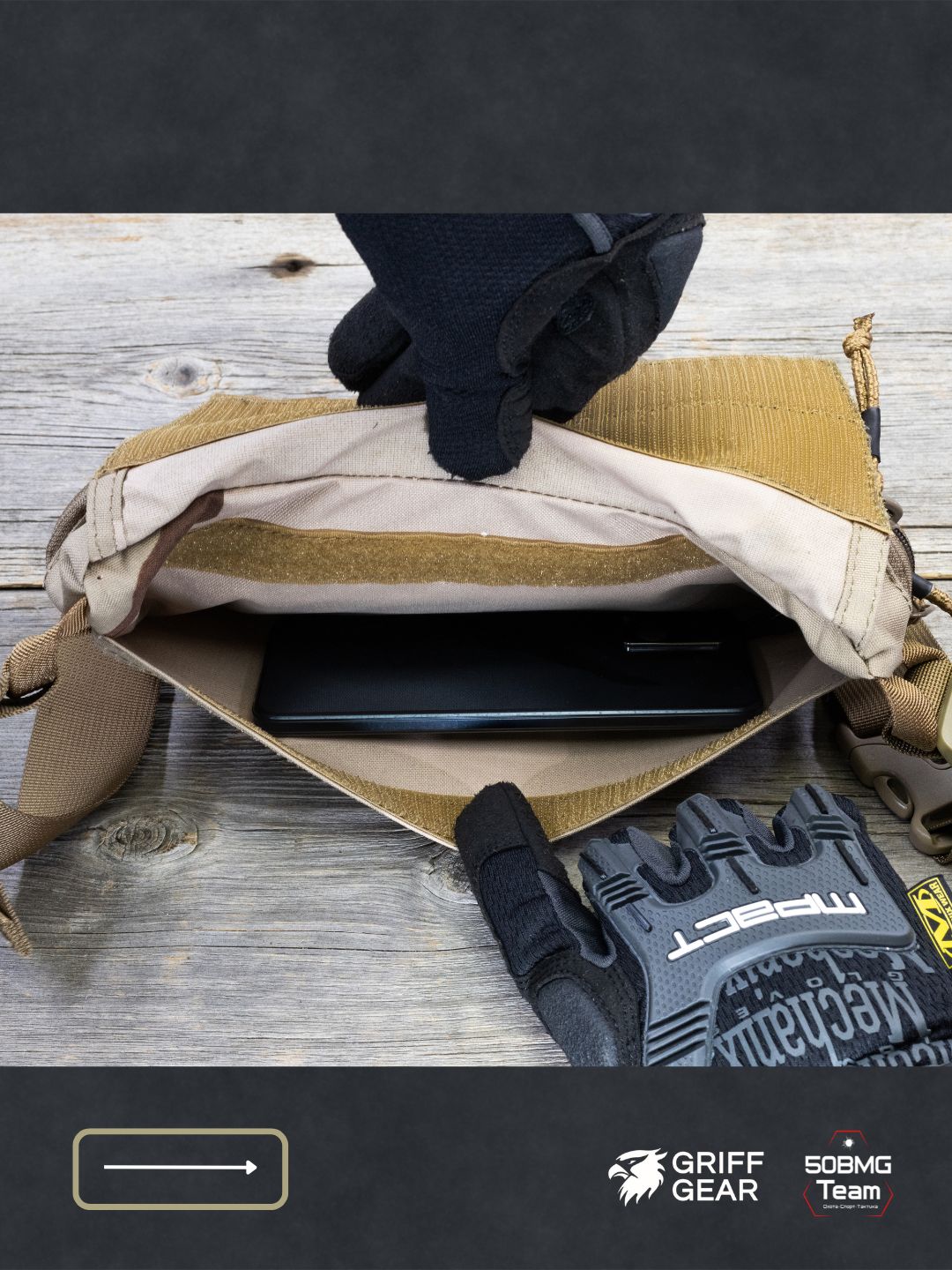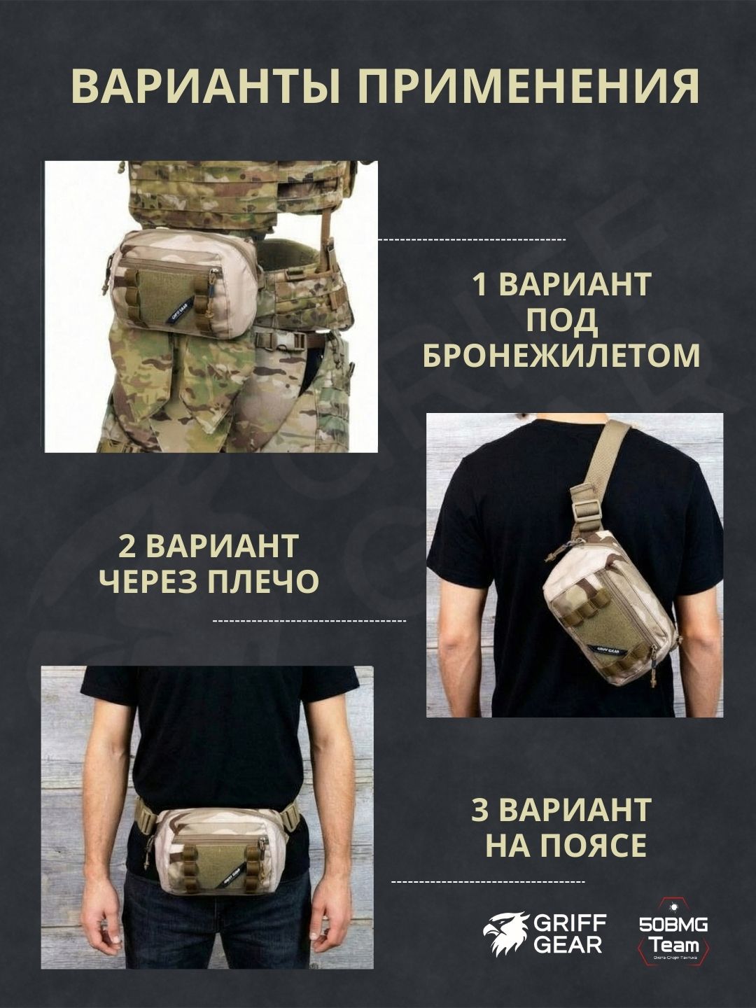 Внутри предусмотрены 4 отсека для удобной организации снаряжения: аптечка и первая помощь, инструменты, ключи, документы, EDC‑набор и т.д. Носить можно тремя способами: напашная под бронежилет, поясная или наплечная, в зависимости от экипировки и задачи.