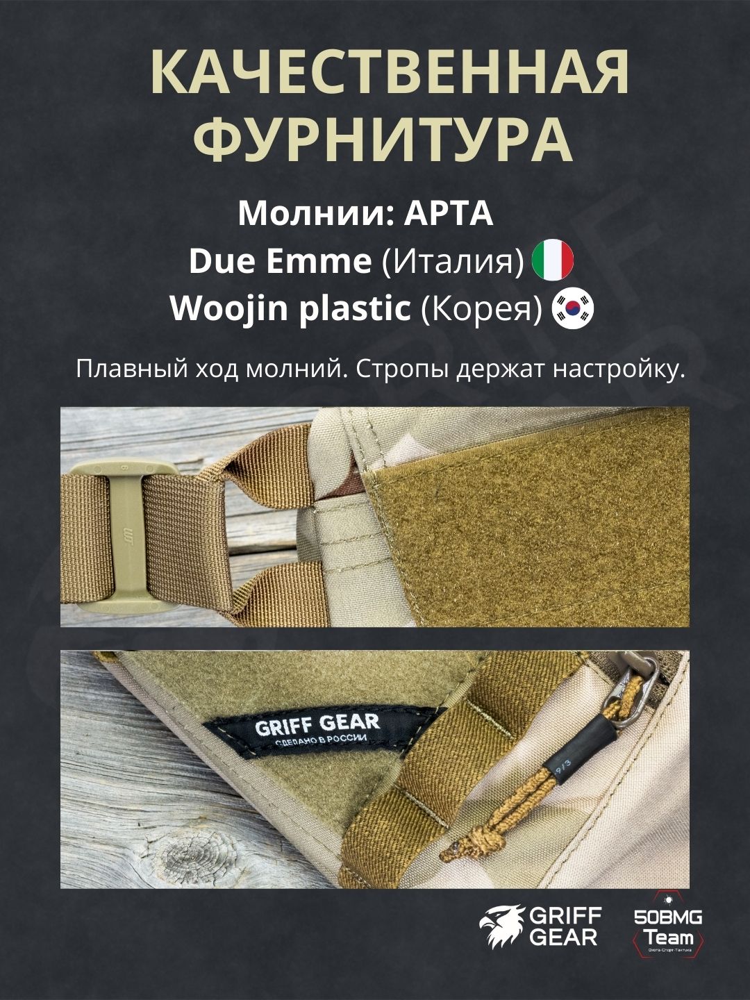 Оснащена велкро‑панелью для крепления под бронежилет. Снаружи размещена липучка под патчи, а также петли под ХИС (химический источник света). В нижней части — две эластичные резинки для фиксации дополнительного снаряжения. Ремень легко регулируется под нужный размер.