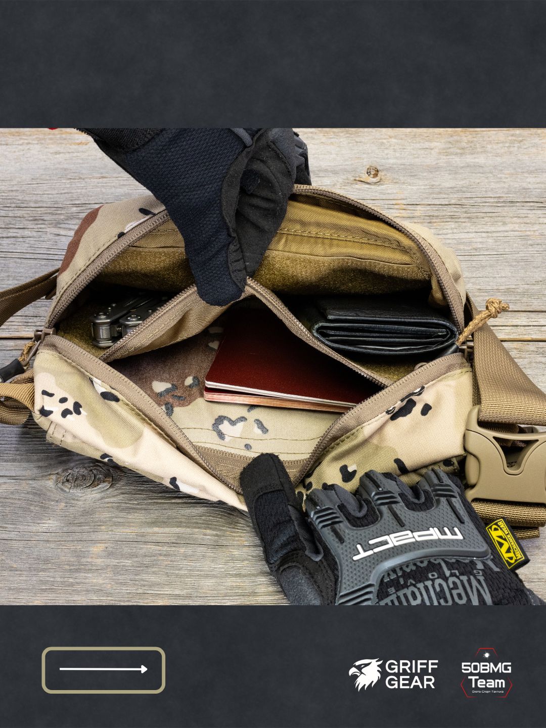 Внутри предусмотрены 4 отсека для удобной организации снаряжения: аптечка и первая помощь, инструменты, ключи, документы, EDC‑набор и т.д. Носить можно тремя способами: напашная под бронежилет, поясная или наплечная, в зависимости от экипировки и задачи.