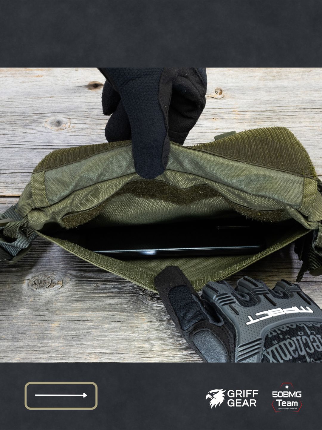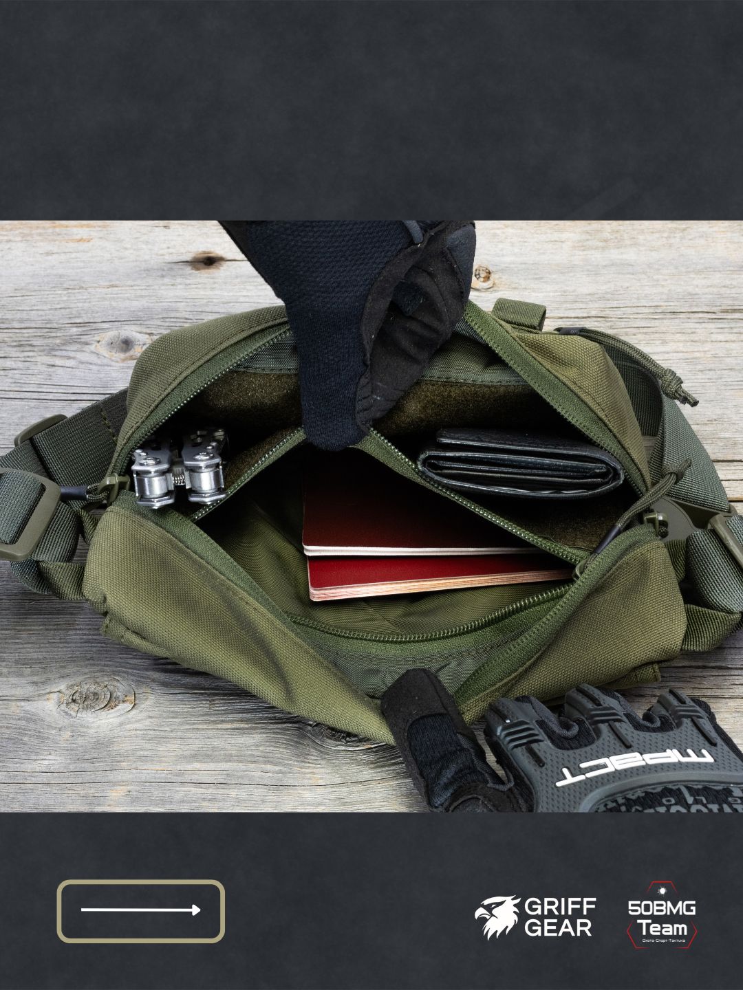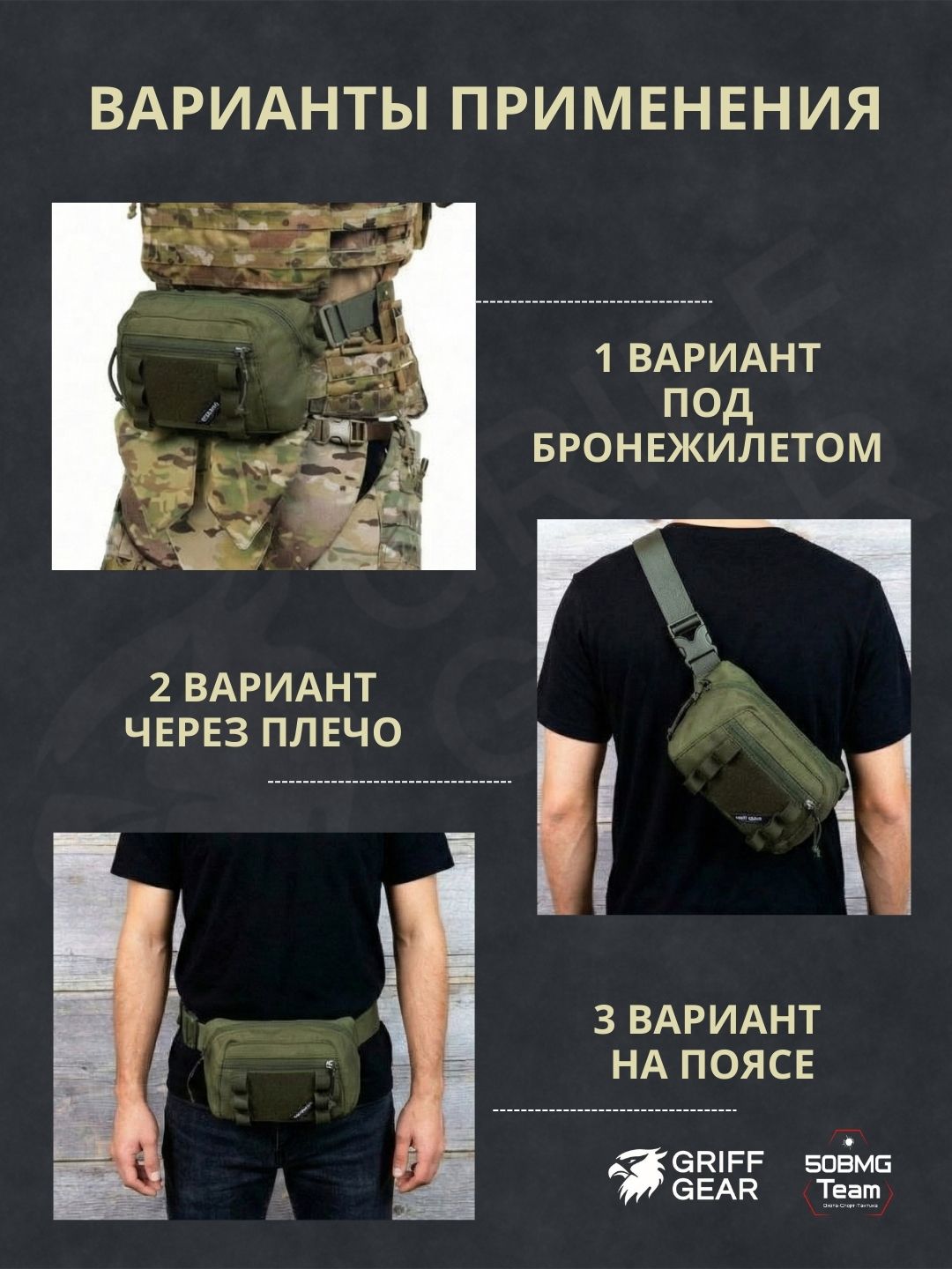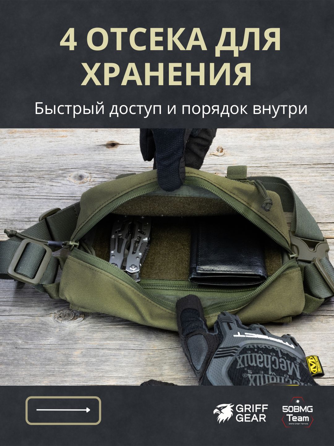 Внутри предусмотрены 4 отсека для удобной организации снаряжения: аптечка и первая помощь, инструменты, ключи, документы, EDC‑набор и т.д. Носить можно тремя способами: напашная под бронежилет, поясная или наплечная, в зависимости от экипировки и задачи.