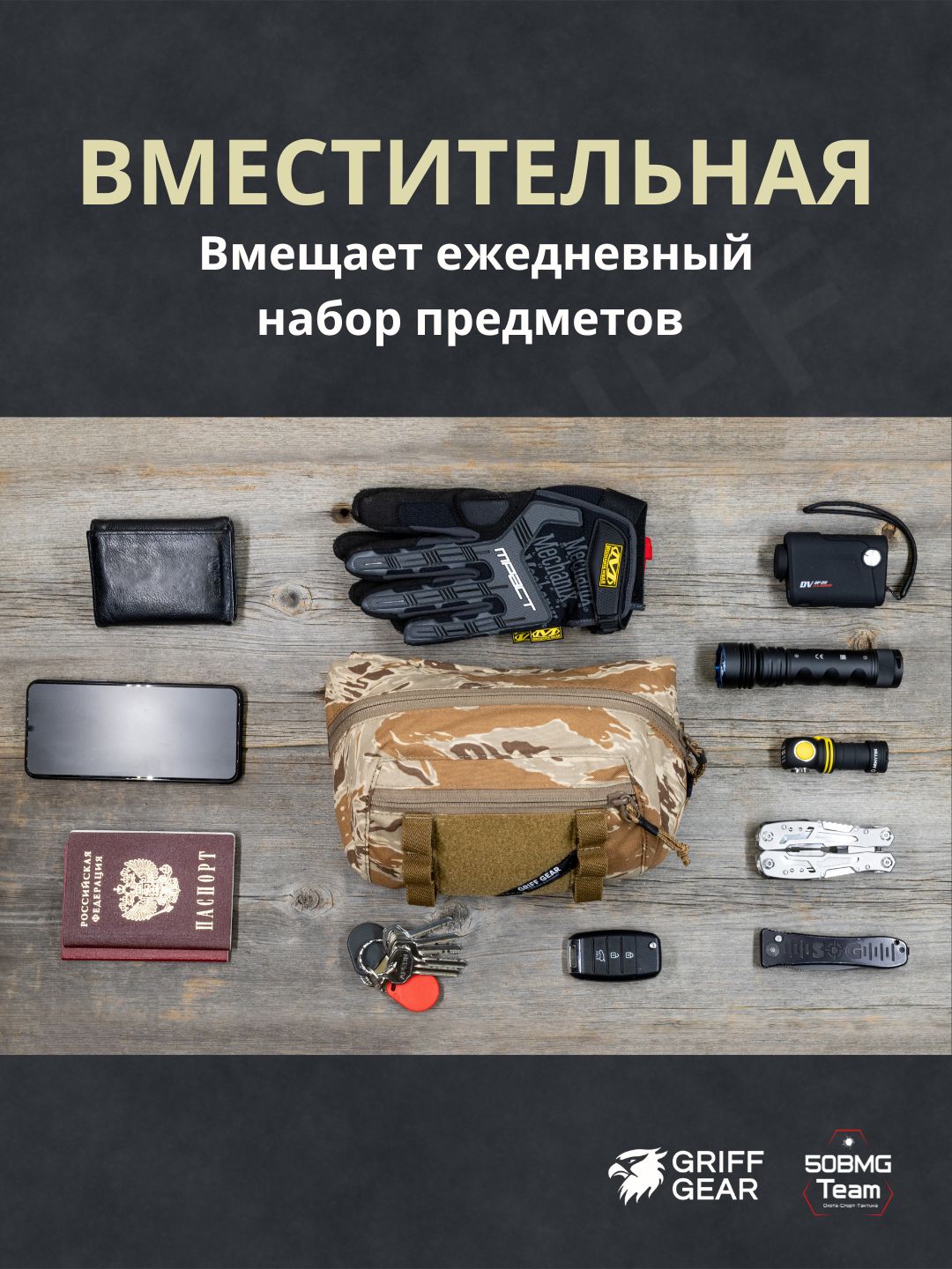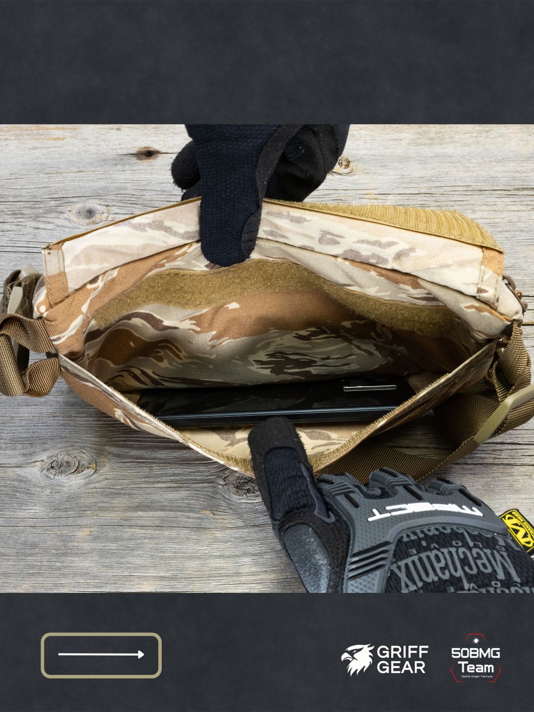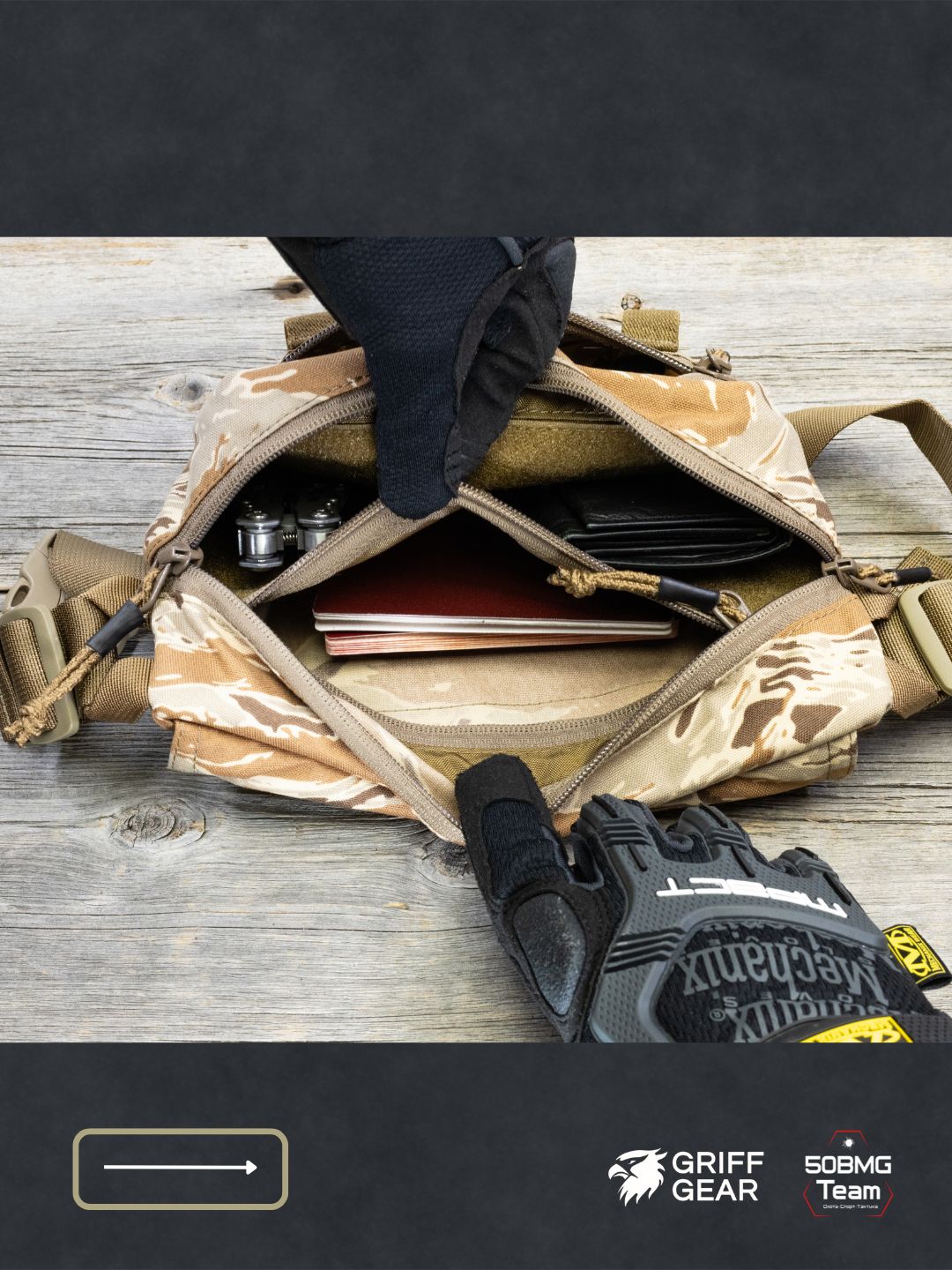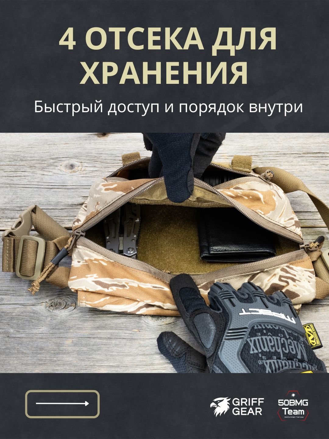 Внутри предусмотрены 4 отсека для удобной организации снаряжения: аптечка и первая помощь, инструменты, ключи, документы, EDC‑набор и т.д. Носить можно тремя способами: напашная под бронежилет, поясная или наплечная, в зависимости от экипировки и задачи.