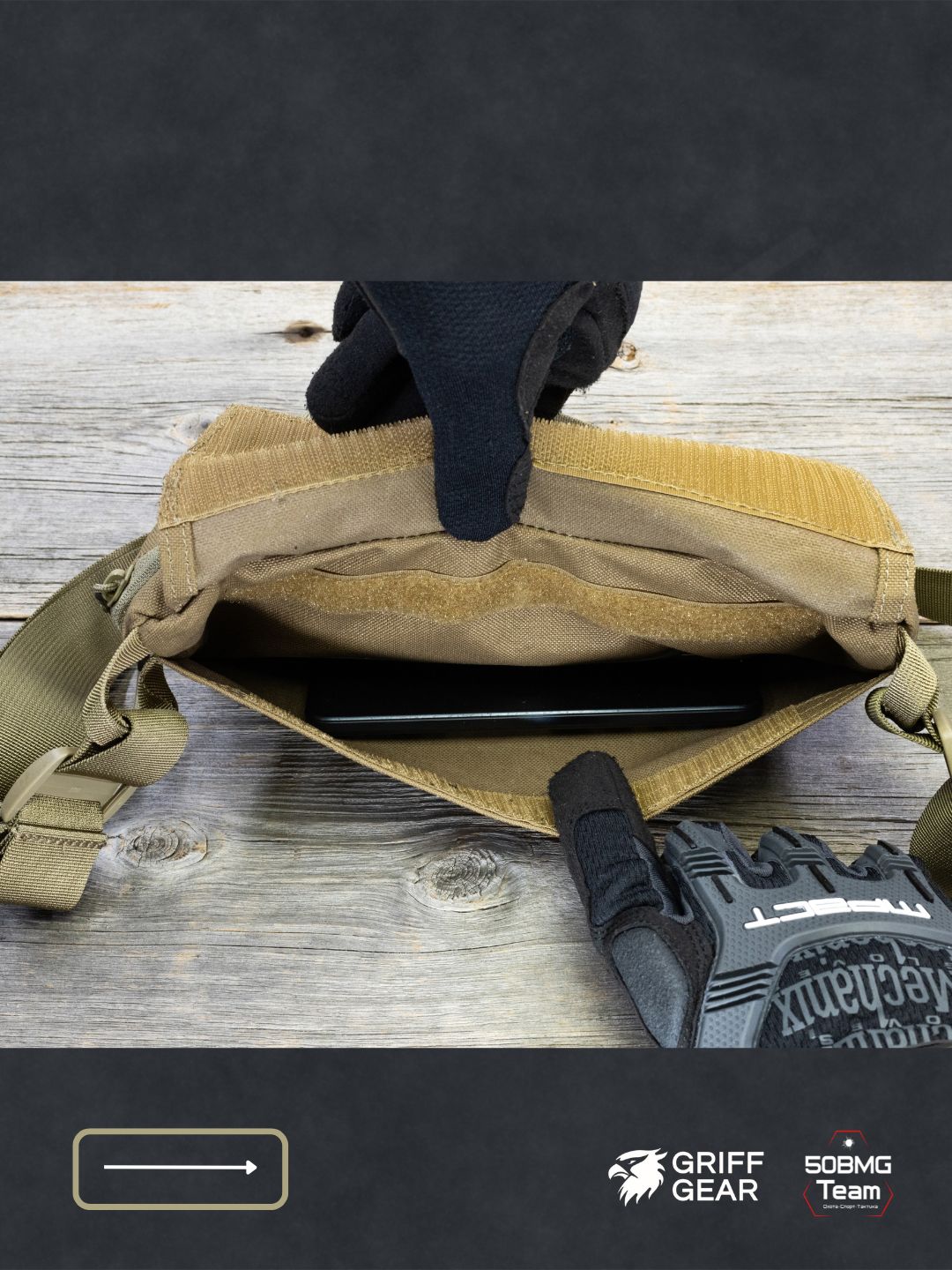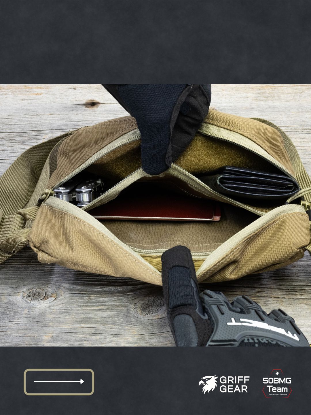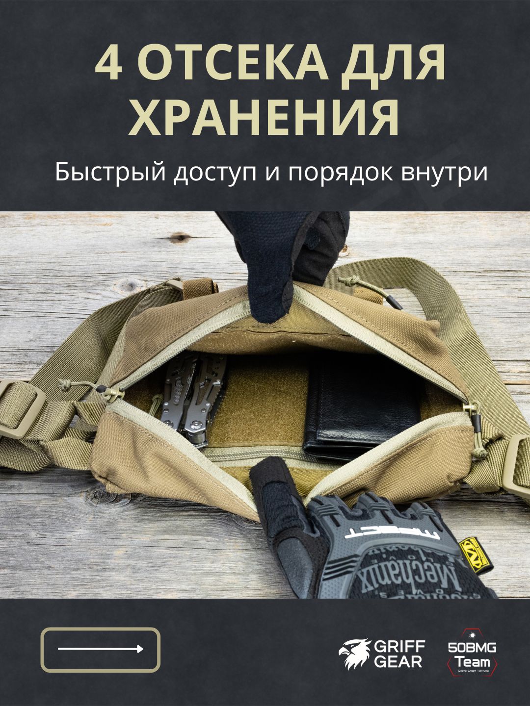 Внутри предусмотрены 4 отсека для удобной организации снаряжения: аптечка и первая помощь, инструменты, ключи, документы, EDC‑набор и т.д. Носить можно тремя способами: напашная под бронежилет, поясная или наплечная, в зависимости от экипировки и задачи.