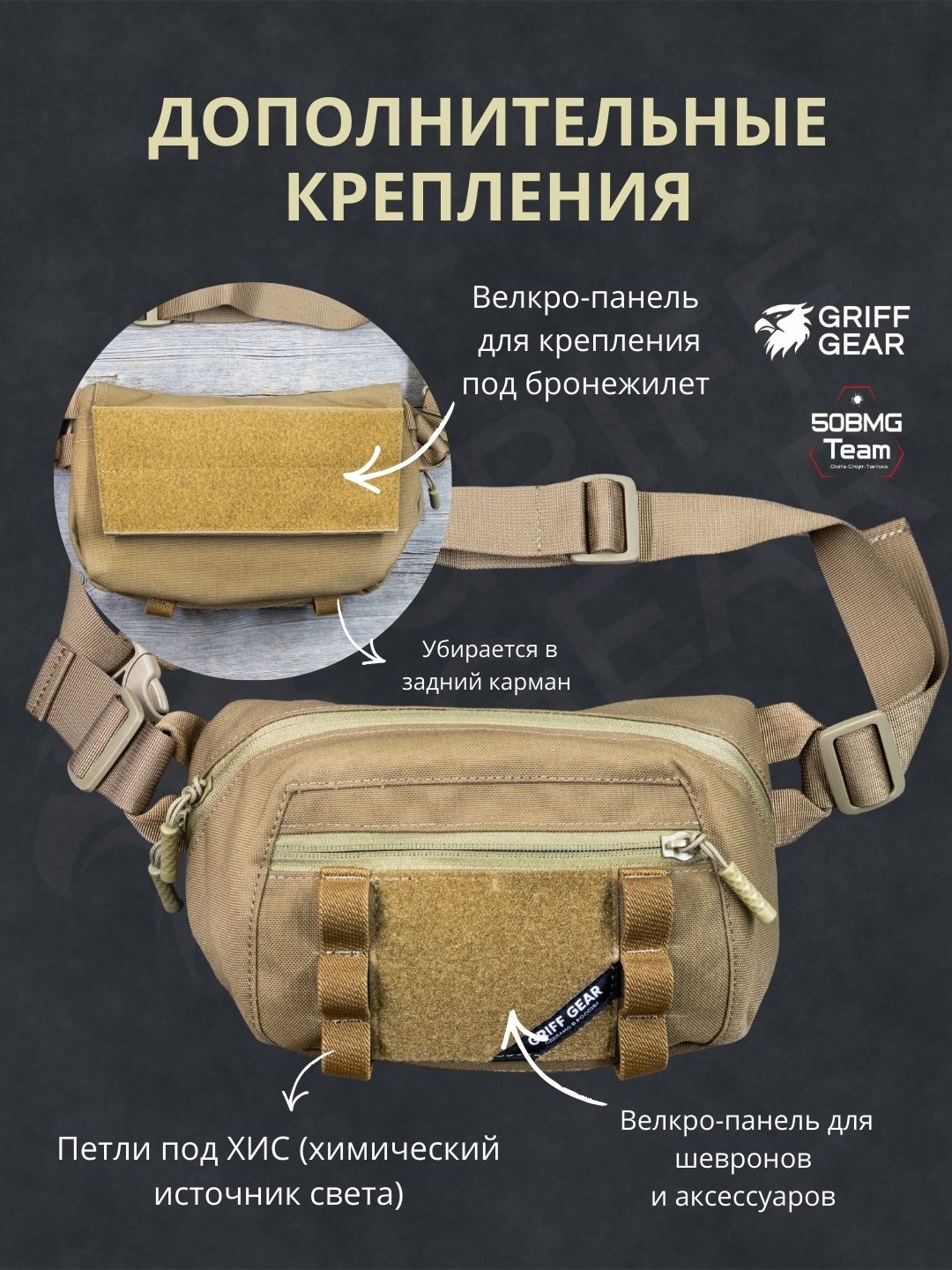 Оснащена велкро‑панелью для крепления под бронежилет. Снаружи размещена липучка под патчи, а также петли под ХИС (химический источник света). В нижней части — две эластичные резинки для фиксации дополнительного снаряжения. Ремень легко регулируется под нужный размер.